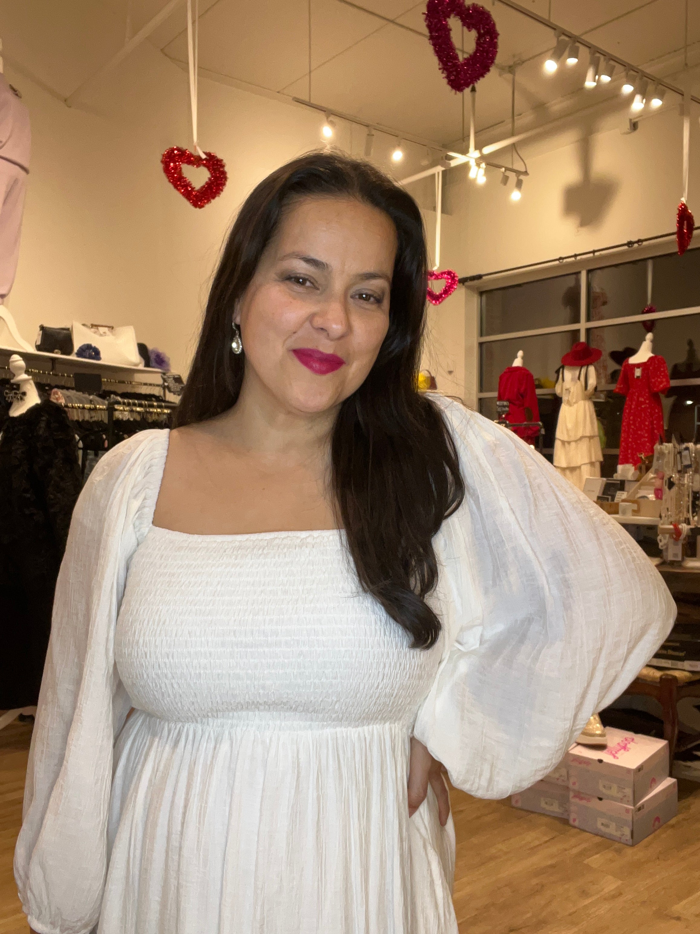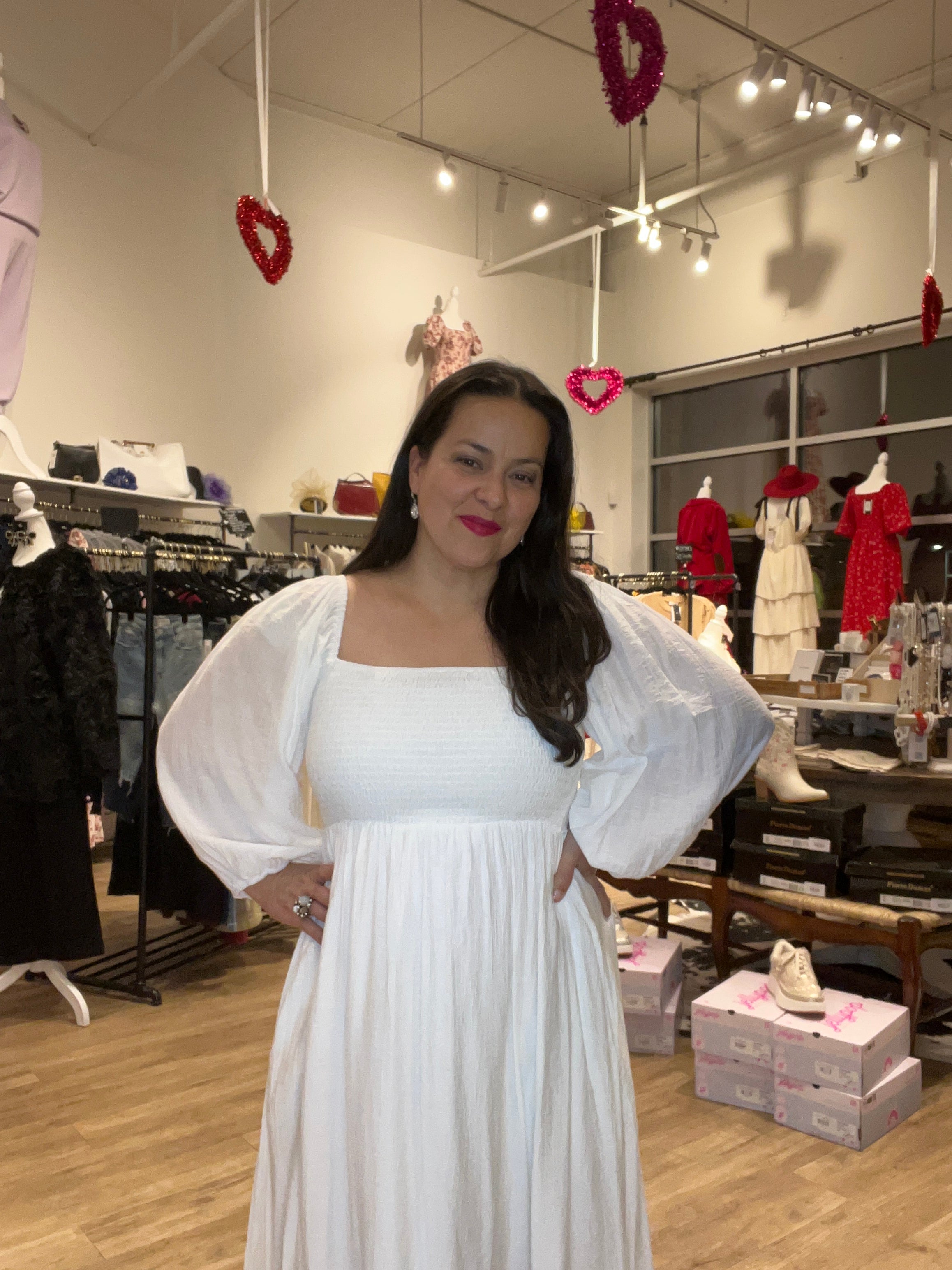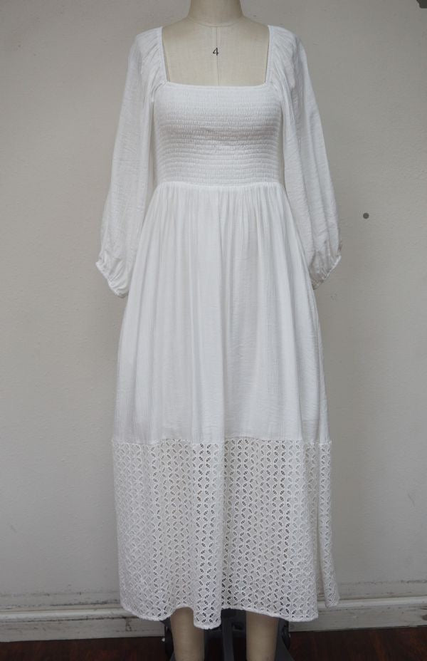 Add a touch of elegance to your wardrobe with the Tammy Eyelet Midi Dress in soft white. This midi dress features delicate eyelet contrast and a smocked design, creating a sophisticated silhouette. The bubble sleeves add a playful touch to this luxurious and exclusive piece.