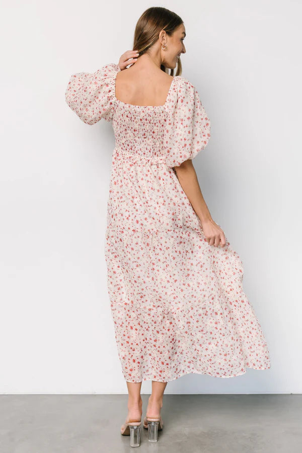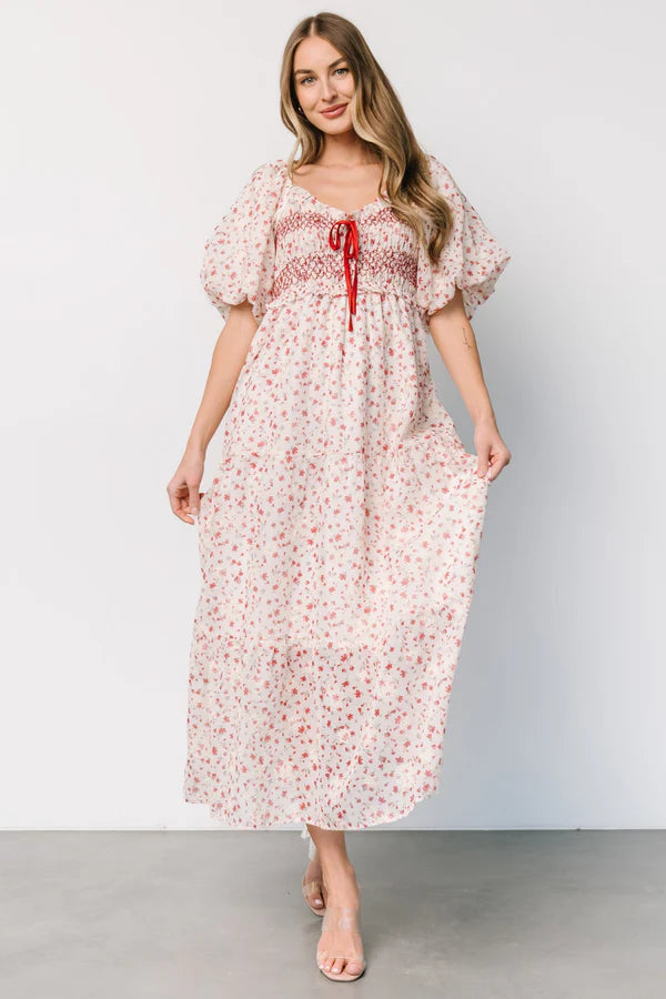 Indulge in elegance with the Molly Floral Maxi Dress in Cream. This delicate masterpiece features a beautiful floral embroidery and bubble sleeves, with liner exuding luxury and exclusivity. The Cream and Red tones add a touch of sophistication to this maxi dress, making it the perfect addition to your wardrobe.